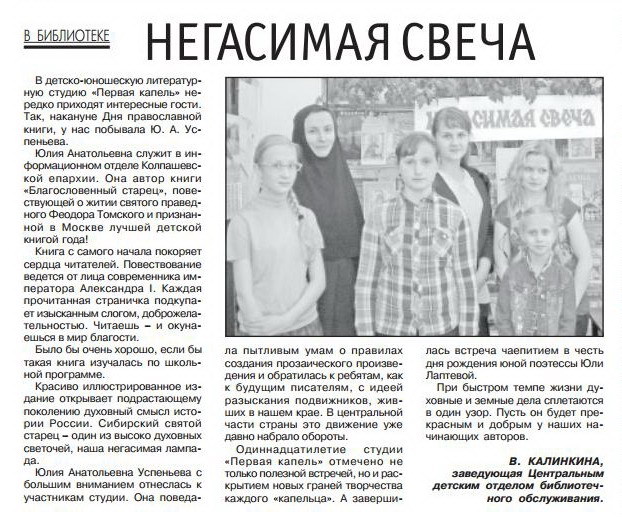 В Центральной детской библиотеке г. Колпашево состоялась встреча участников мастерской слова «Первая капель» с автором детской книги о жизни известного сибирского святого Феодора Томского «Благословеный старец».