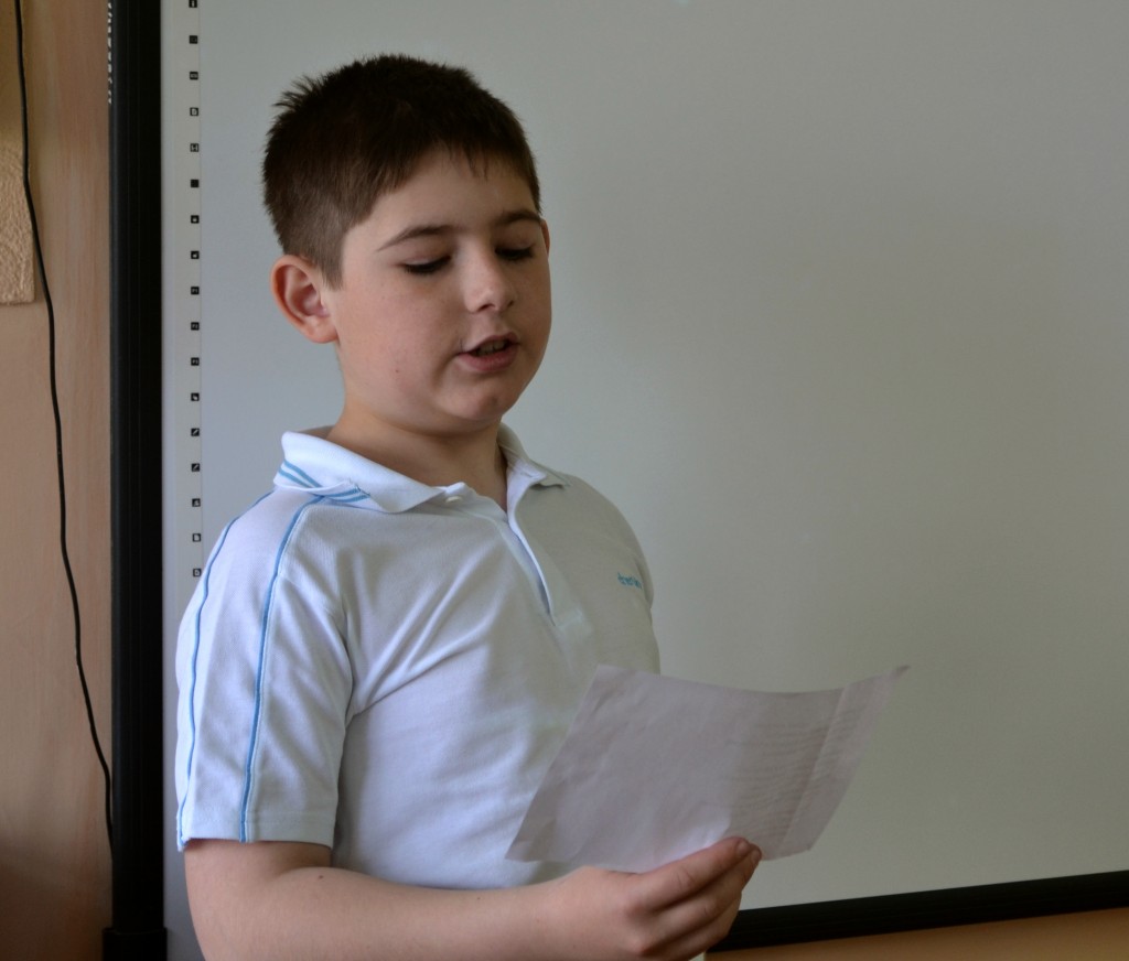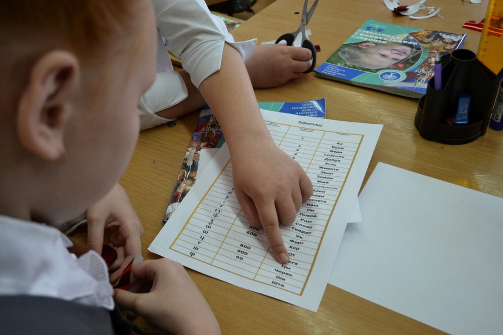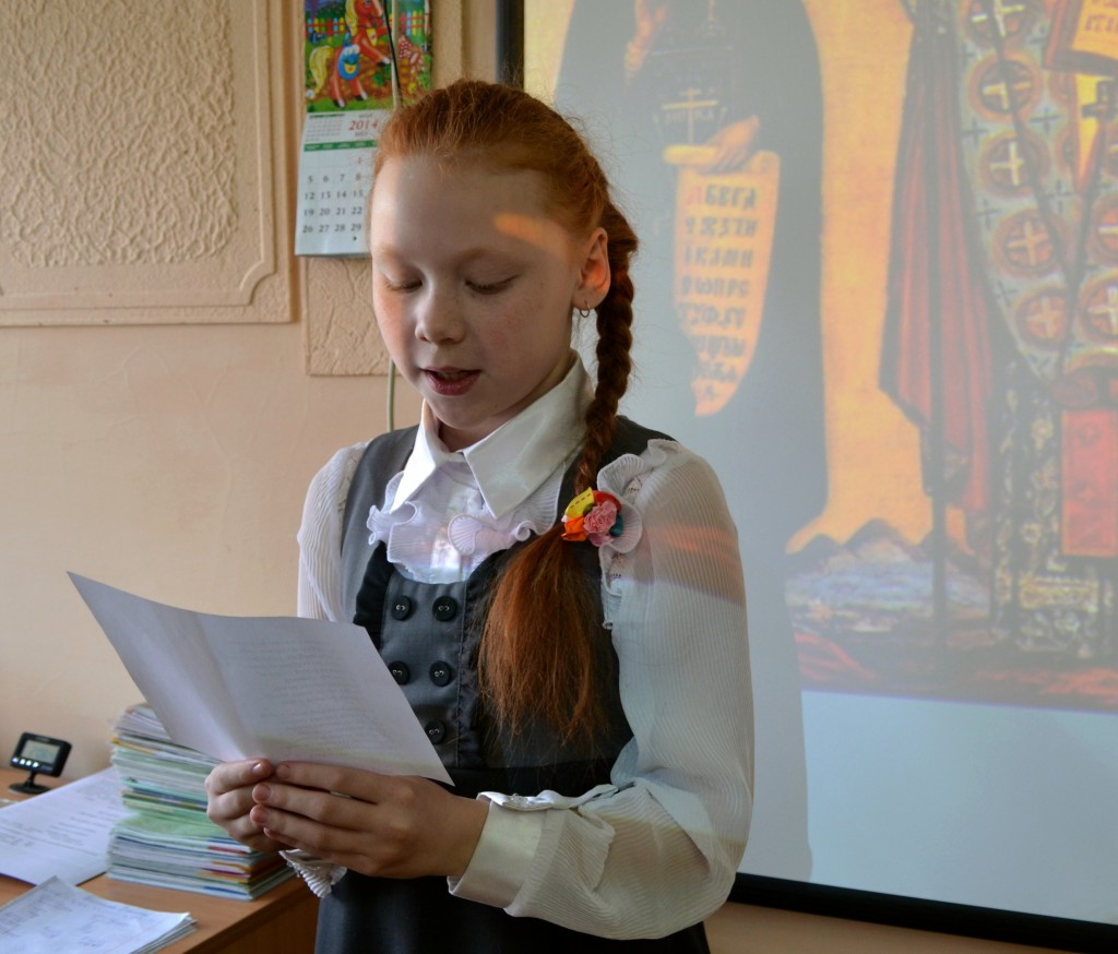 Ученикам 4-го класса библиотекарь В. М. Луговская рассказала о подвиге святых братьев Кирилла и Мефодия. Во время уроки прозвучали поэтические произведения о просветителях славян. Ребята познакомились с глаголицей и кириллицей, завершилось занятие коллективным составлением азбуки — кириллицы.