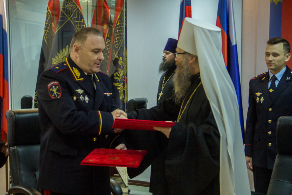 6 ноября в холле административного здания УМВД России по Томской области состоялось церемония торжественного подписания Соглашения о сотрудничестве между епархиями, входящими в состав Томской митрополии и УМВД России по Томской области.