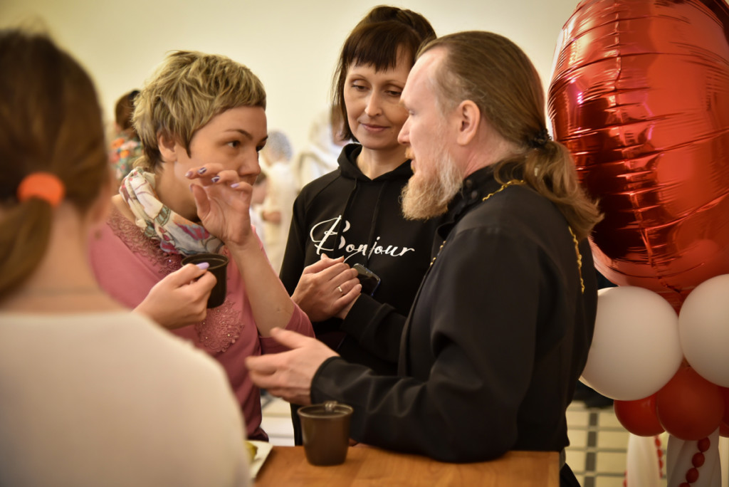После спектакля всех пришедших на праздник ждали горячий чай и угощения, во время которого можно было пообщаться друг с другом. Программа продолжилась хороводами и пасхальными народными играми, подготовленными фольклорным ансамблем «Горенка» из Детско-юношеского центра. Далее начали работу три площадки: в библиотеке центра работал кинозал, в котором можно было посмотреть замечательный фильм «Притчи», желающие помастерить и порисовать могли расположиться в кабинете воскресной школы, где проходил мастер-класс.