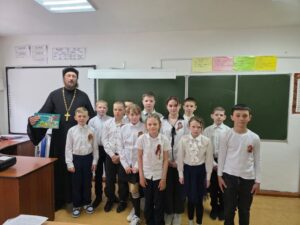 6 мая 2025 года, вторник 3-й седмицы по Пасхе, в день памяти Великомученика Георгия Победоносца, благочинный Южного округа Колпашевской епархии иерей Михаил Семергей посетил Тунгусовскую среднюю школу, где провел открытый урок и классный час для учеников 4-5 классов.