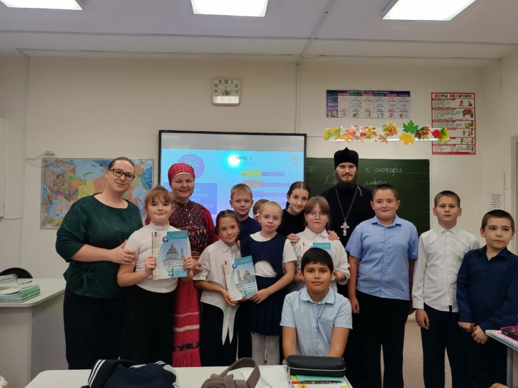 Отец Александр вместе с преподавателем дисциплины Малыгиной Галиной Владимировной и руководителем школьного Фольклорного ансамбля «Горенка» Голосовой Юлией Александровной в трех четвертых классах рассказали о том, что ожидает детей на уроках ОПК и какое важное значение имеет знание основ Православной культуры.