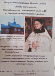 Вечером того же дня в Доме культуры с. Степановка был проведен вечер памяти убиенного священника, посвященный 16-летию со дня его смерти. Гости вечера узнали о жизни отца Даниила, посмотрели видеоотрывки его выступлений и музыкальные видеоролики. Также был представлен доклад с презентацией на тему: «Оценка советского периода истории Церкви и его последствий в трудах иерея Даниила Сысоева».