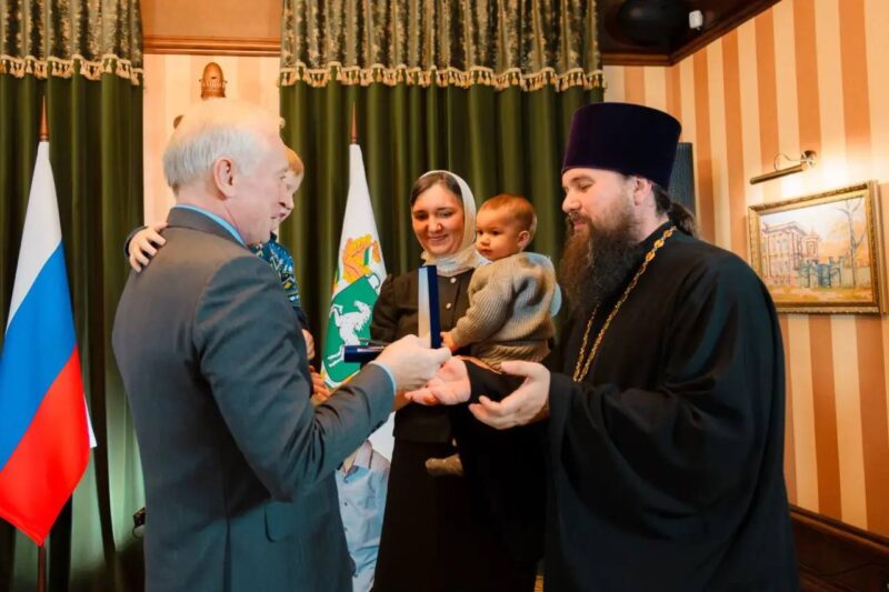 Размещено 10.12.2025 в 1280 × 853 в Губернатор Томской области Владимир Мазур в преддверии Дня матери вручил знак «Родительская доблесть» многодетной семье секретаря Колпашевской епархии священника Иоанна Усачева и его супруги Екатерины