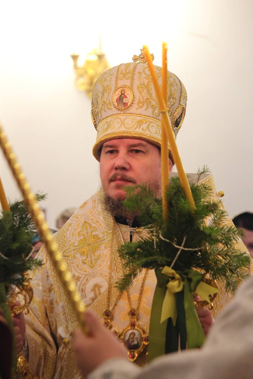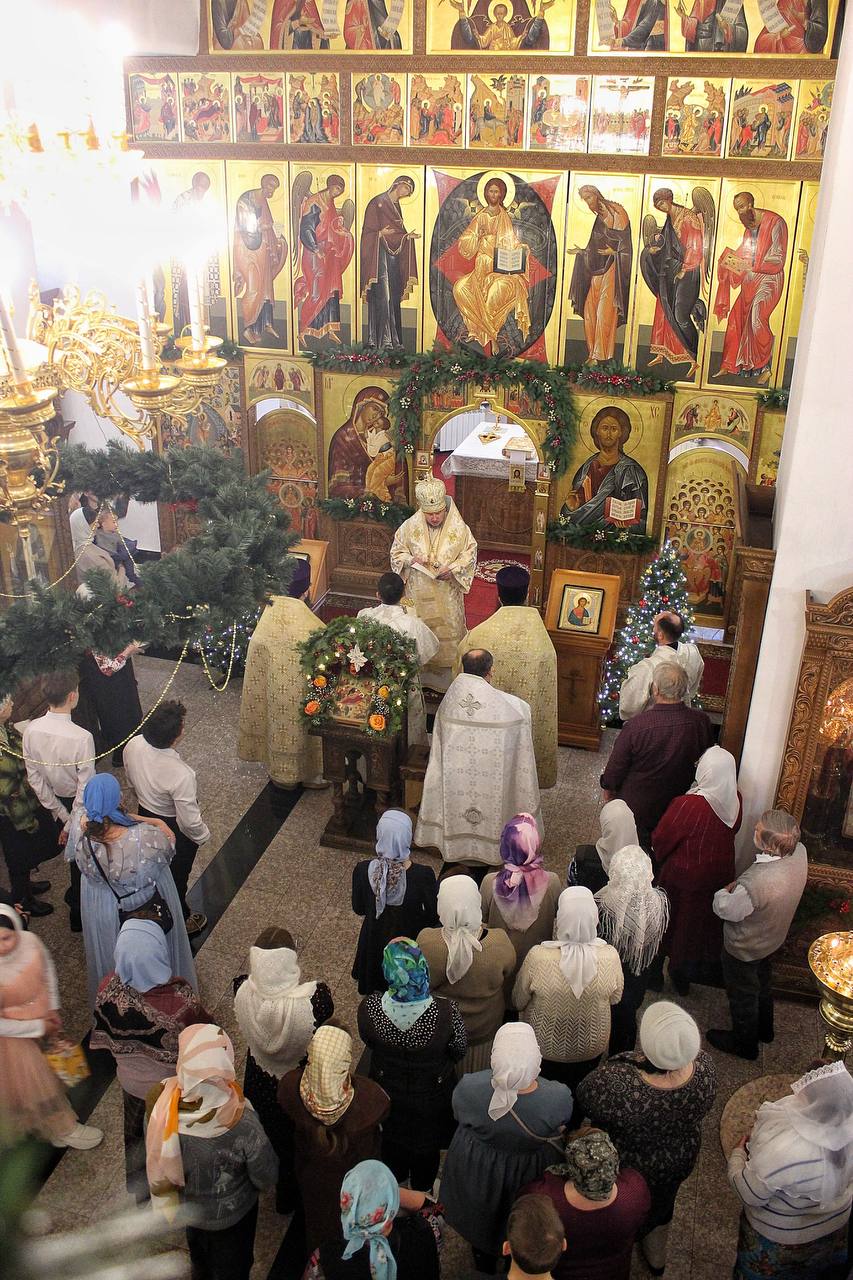 После отпуста было совершено славление Рождеству Христову, после чего владыка зачитал праздничное послание Святейшего Патриарха Московского и всея Руси Кирилла и обратился ко всем собравшимся со словами поздравления.