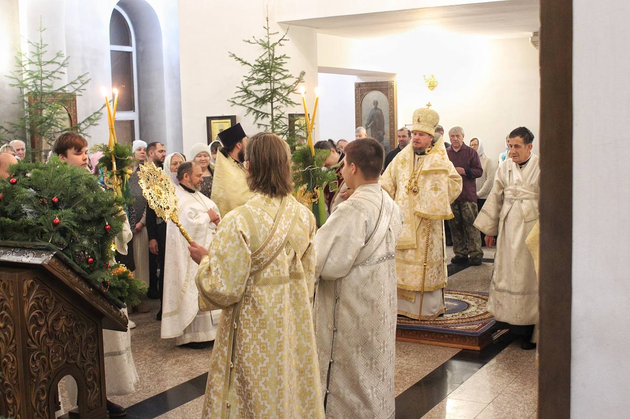 6-7 января 2026 года, в праздник Рождества Господа Бога и Спаса нашего Иисуса Христа, в Вознесенском кафедральном соборе г. Колпашево была совершена череда рождественских богослужений ― великое повечерие, утреня и Божественная литургия святителя Иоанна Златоуста.