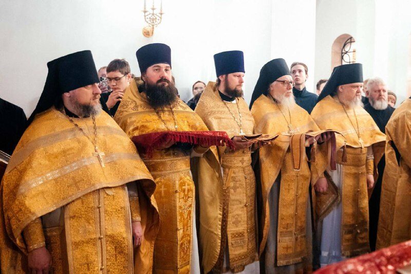 Размещено 24.02.2026 в 800 × 533 в В день памяти Великих Вселенских святителей и учителей Василия Великого, Григория Богослова и Иоанна Златоустого, епископ Колпашевский и Стрежевской Филарет в Трёхсвятительском храме Богородице-Алексиевского монастыря сослужил за Божественной литургией митрополиту Томскому и Асиновскому Ростиславу