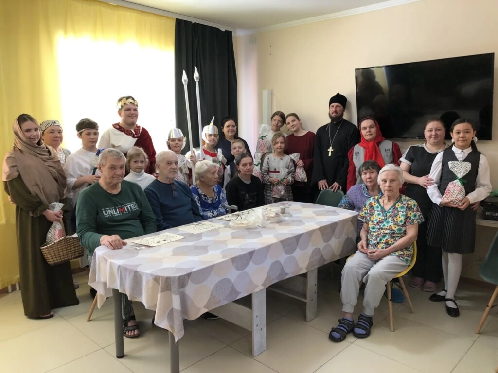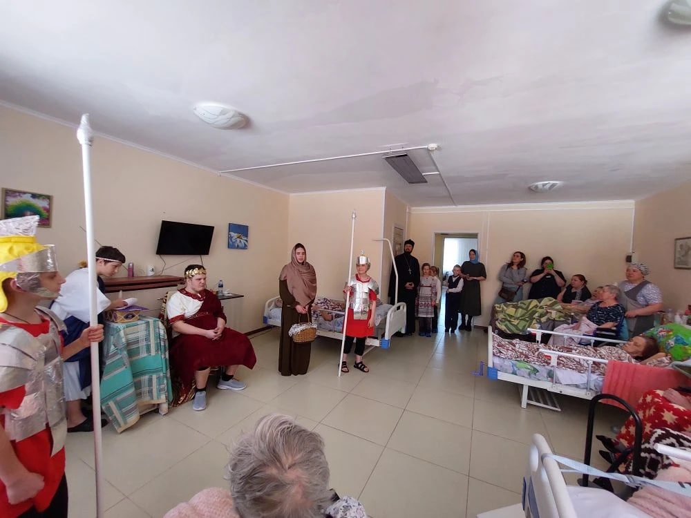 Ребята показали театральную постановку матушки Юлии Мезенцевой «Первое пасхальное яичко» — историю о том, как появилась традиция красить яйца на Пасху. А затем гости раздали жителям пансионата и персоналу имбирные прянички, раскрашенные своими руками.