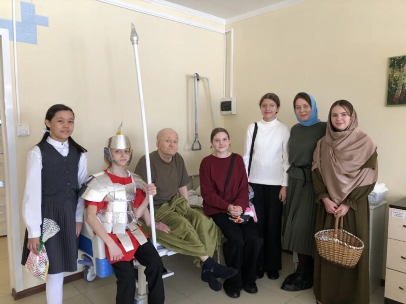 Размещено 25.04.2026 в 1024 × 768 в Учащиеся воскресной школы храма святителя Николая г. Стрежевого во главе с ключарем иереем Александром Хохловым посетили находящихся на излечении в пансионате «Добромир», где поздравили пациентов и сотрудников учреждения с праздников Святой Пасхи