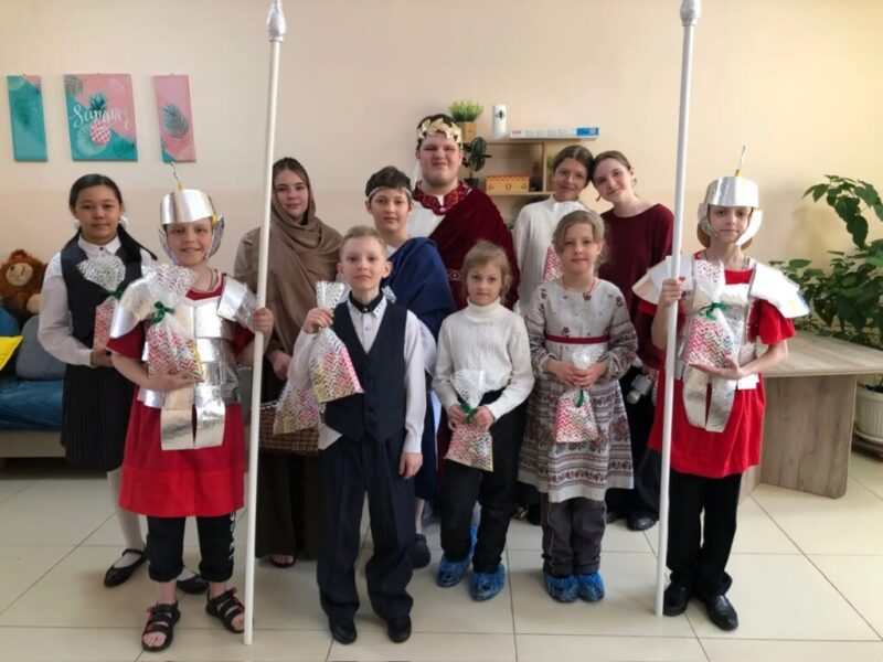 Размещено 25.04.2026 в 1024 × 768 в Учащиеся воскресной школы храма святителя Николая г. Стрежевого во главе с ключарем иереем Александром Хохловым посетили находящихся на излечении в пансионате «Добромир», где поздравили пациентов и сотрудников учреждения с праздников Святой Пасхи